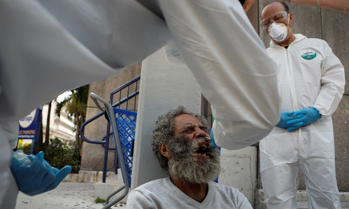Một người đàn ông vô gia cư ở thành phố Miami, bang Florida được lấy mẫu xét nghiệm Covid-19 hôm 16/4. Ảnh: Reuters.