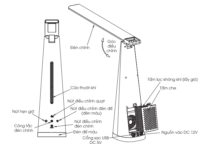 4. Nhấn và giữ phím đèn chính sẽ nhấp nháy 2 lần, xác nhận bộ hẹn giờ đã mở. Sau 40 phút đèn chính sẽ tự tắt. Lưu ý quạt và đèn nền ở đế không tự tắt.