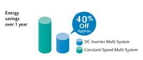 Các hệ thống Multi Type System với nhiều DC Inverter giúp tiết kiệm năng lượng hoạt động và hiệu quả cao hơn 40% so với hệ thống đơn hoạt động liên tục với hiệu suất tối đa. Hệ thống biến tần được trang bị một máy DC nén đôi. Nó có thể đạt được nhiệt độ mà bạn thiết lập nhanh hơn 15% so với các hệ thống thông thường và nó duy trì chính xác nhiệt độ cài đặt trước với sự khác biệt chỉ 0.5 °C. Do có DC nén đôi tiên tiến hoạt động với hiệu suất rất tốt
