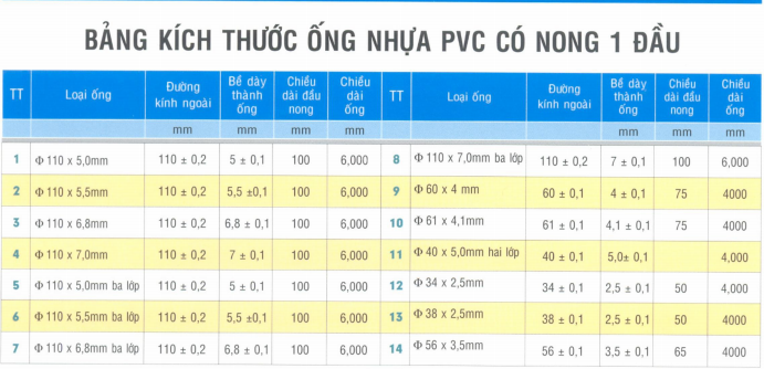 Kích thước ống nhựa uPVC có nong 1 đầu