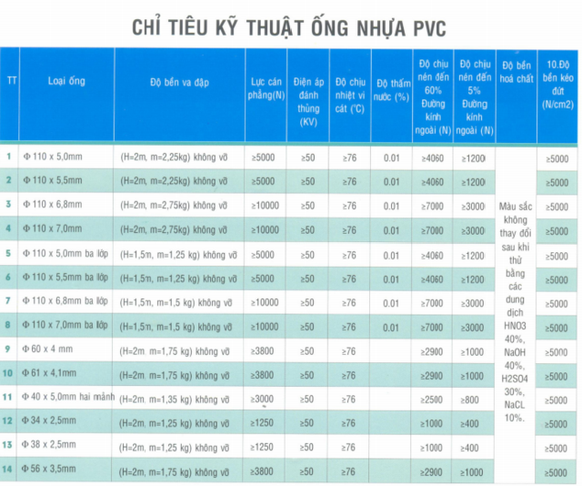 Chỉ tiêu kỹ thuật ống nhựa uPVC