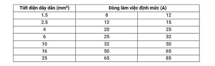 Bảng tham khảo dòng điện định mức một số loại đây điện